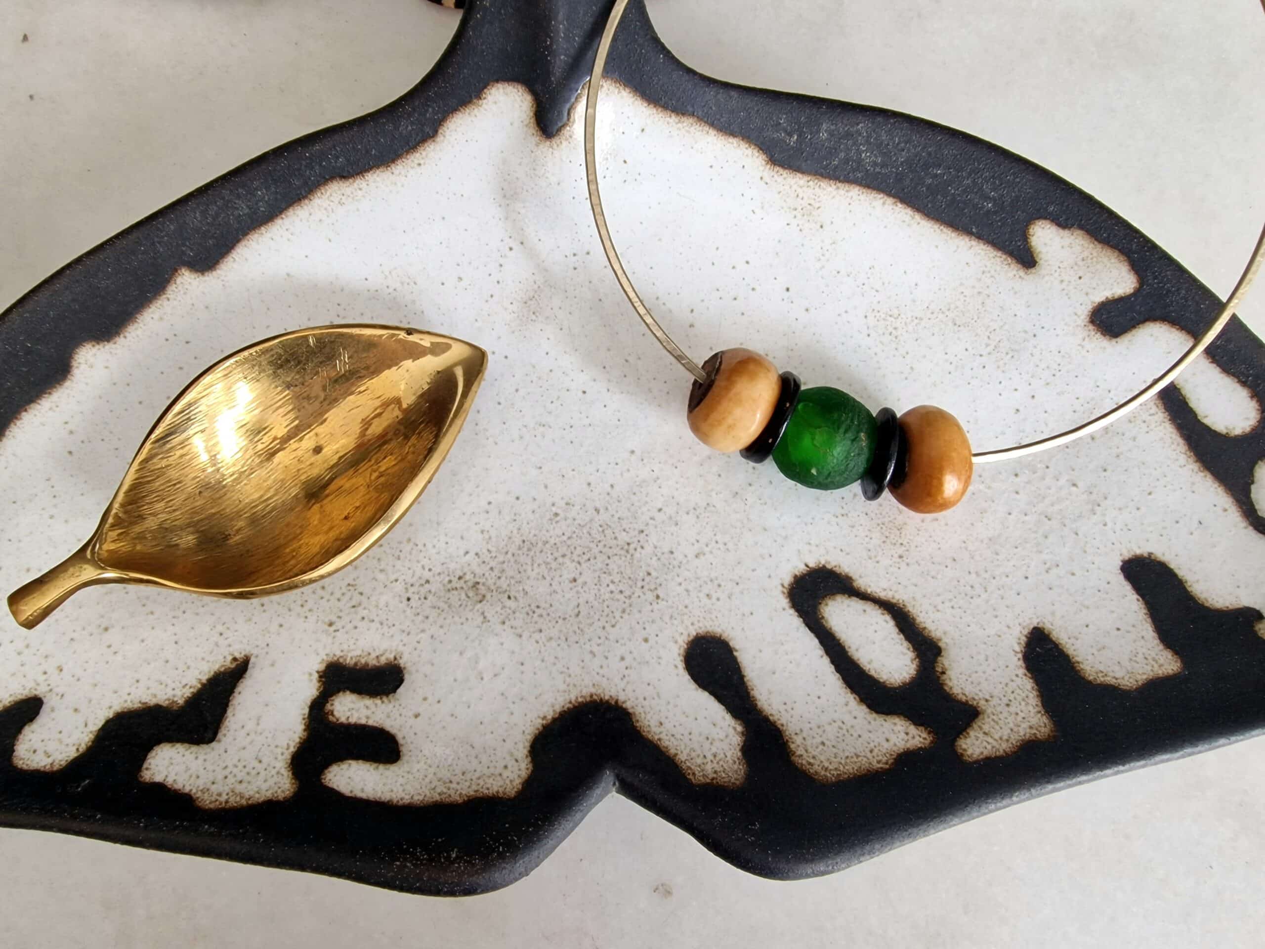 Choker de alpaca martillada a mano con 2 piezas de hueso en color tostado y 1 cristal africana reciclado en verde seco.