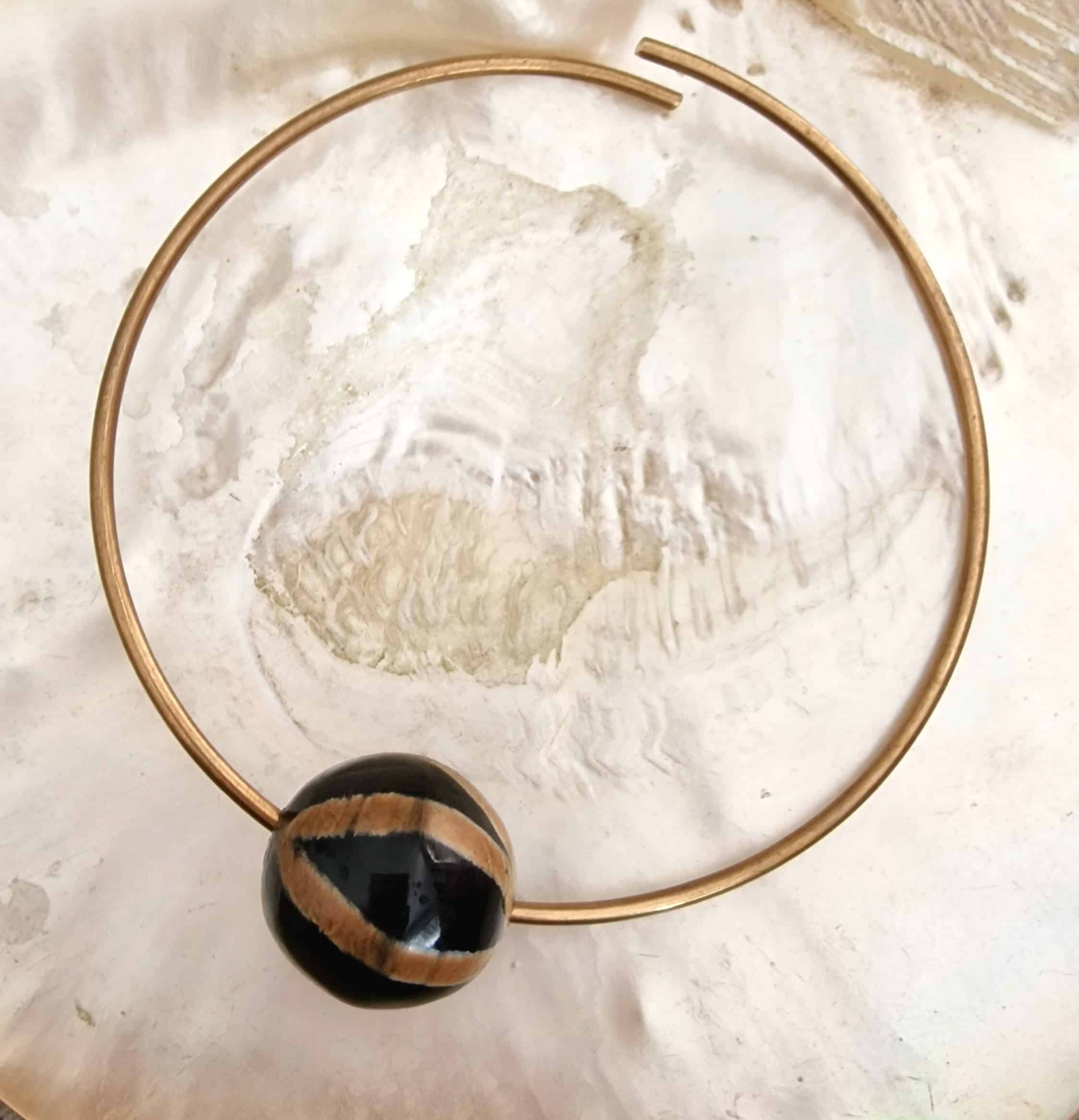 Choker de latón con pieza de hueso redondo con rayas en color moka.