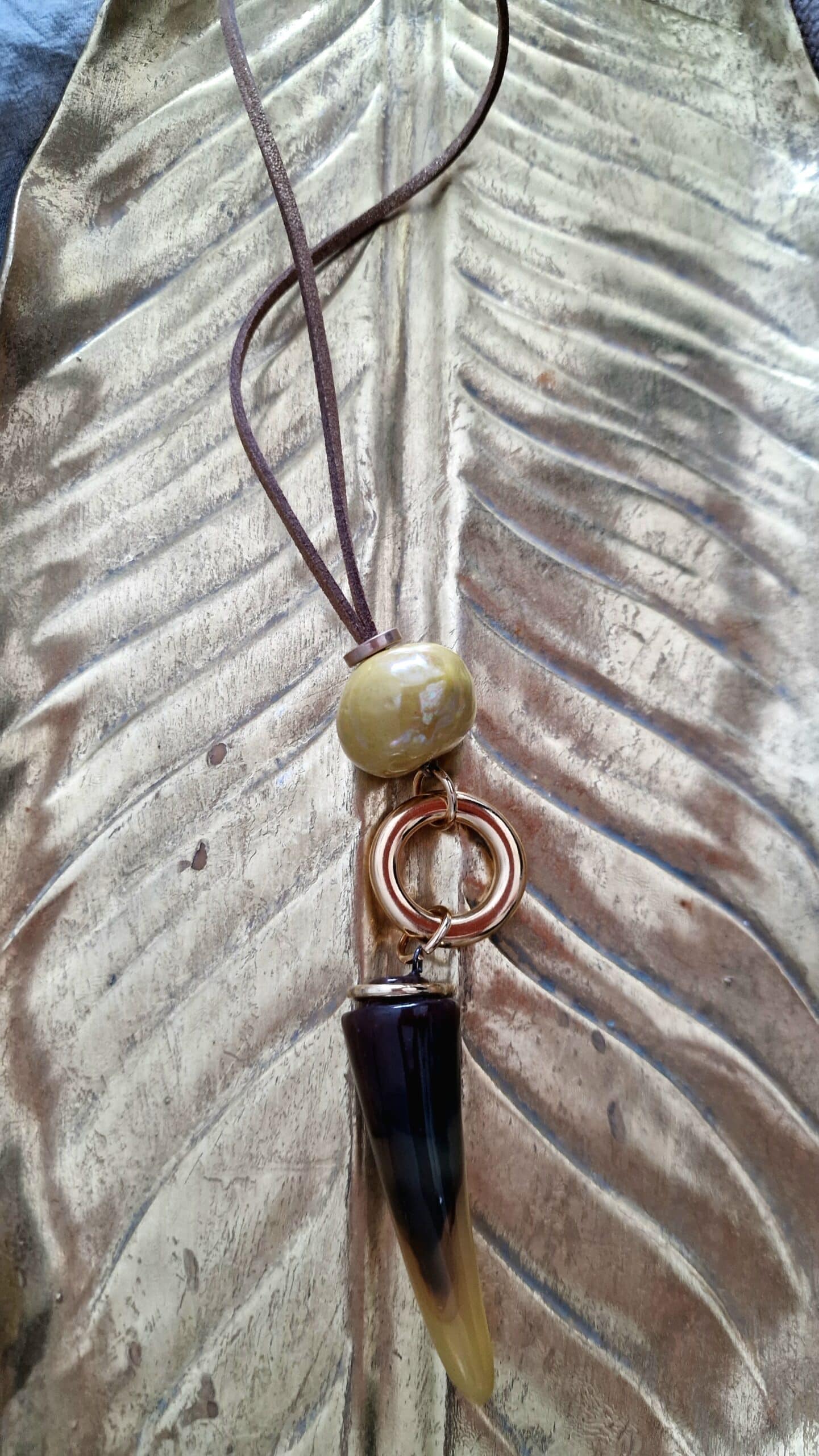 Collar largo con colmillo de resina aro dorado y pieza de ceràmica con ante dorado.