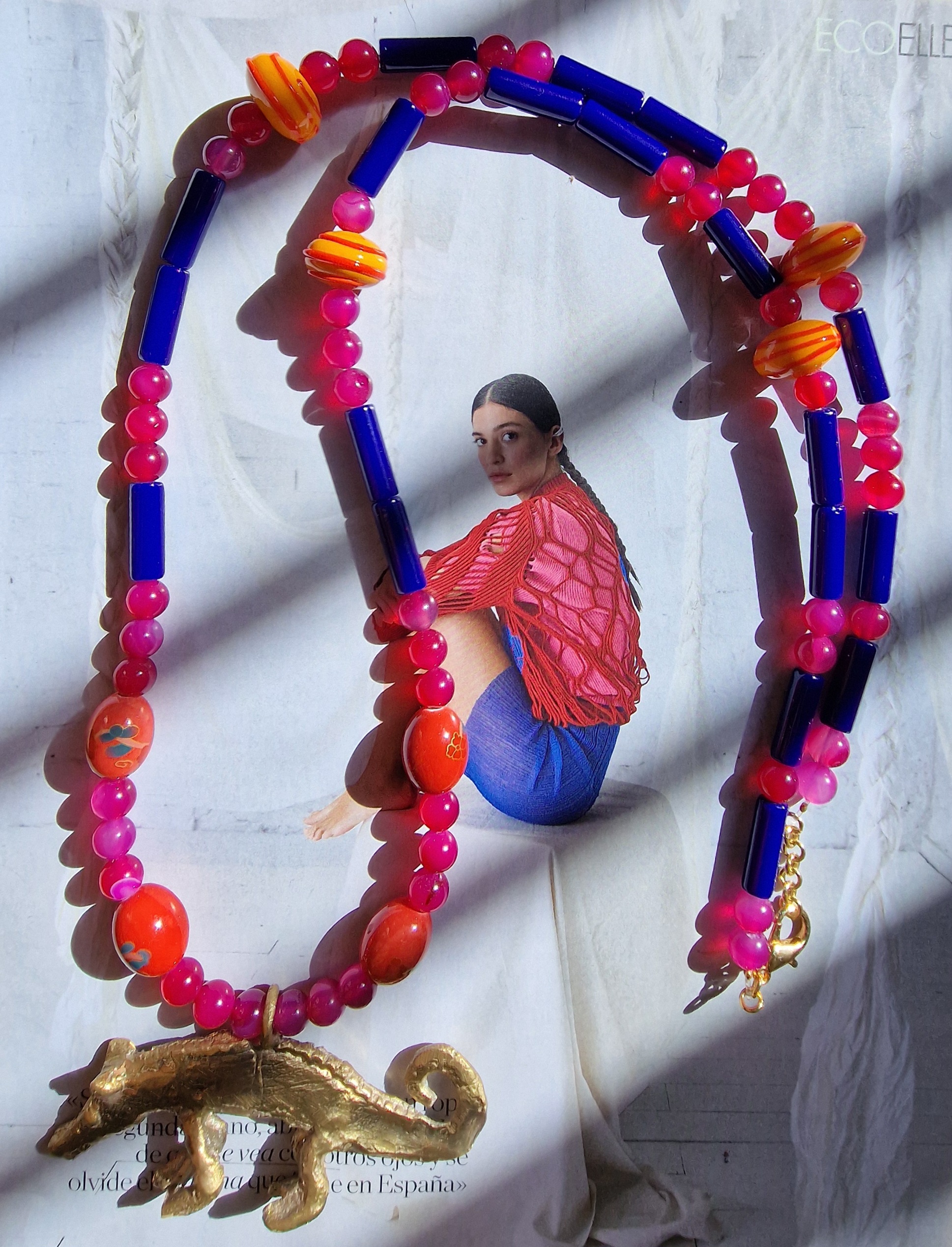Collar largo de cristal,cerámica y Ágatas con pieza de latón ,lleva alargador