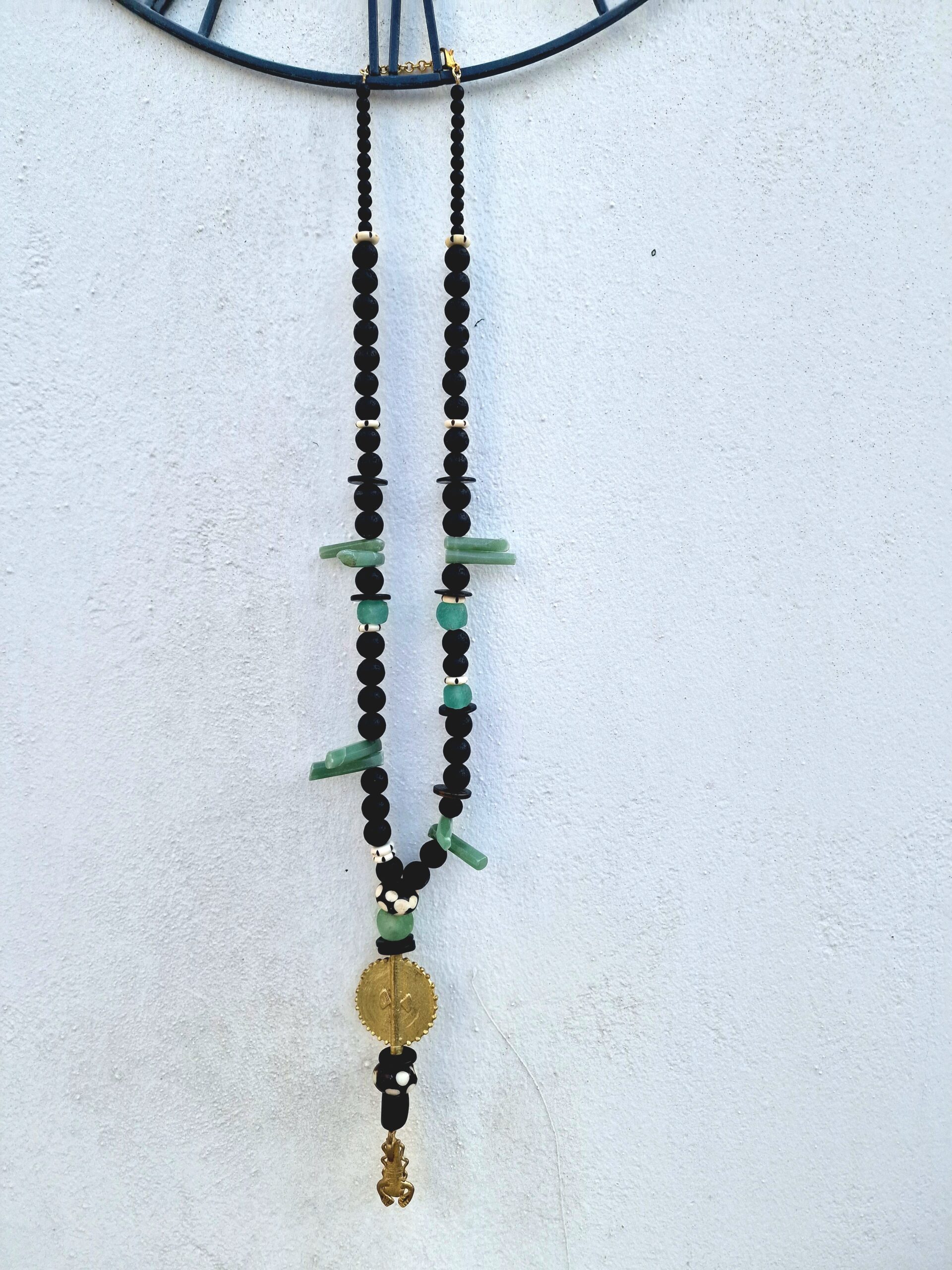 Collar de piedras volcánicas,cristal reciclado,hueso y jade con medallón de latón,mide 60cm de largo,lleva alargador