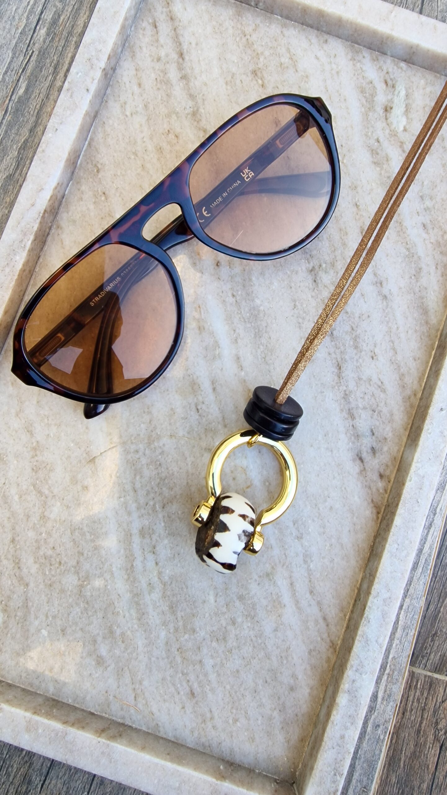 Collar bañado en oro con pieza de hueso y madera,con ante dorado.
