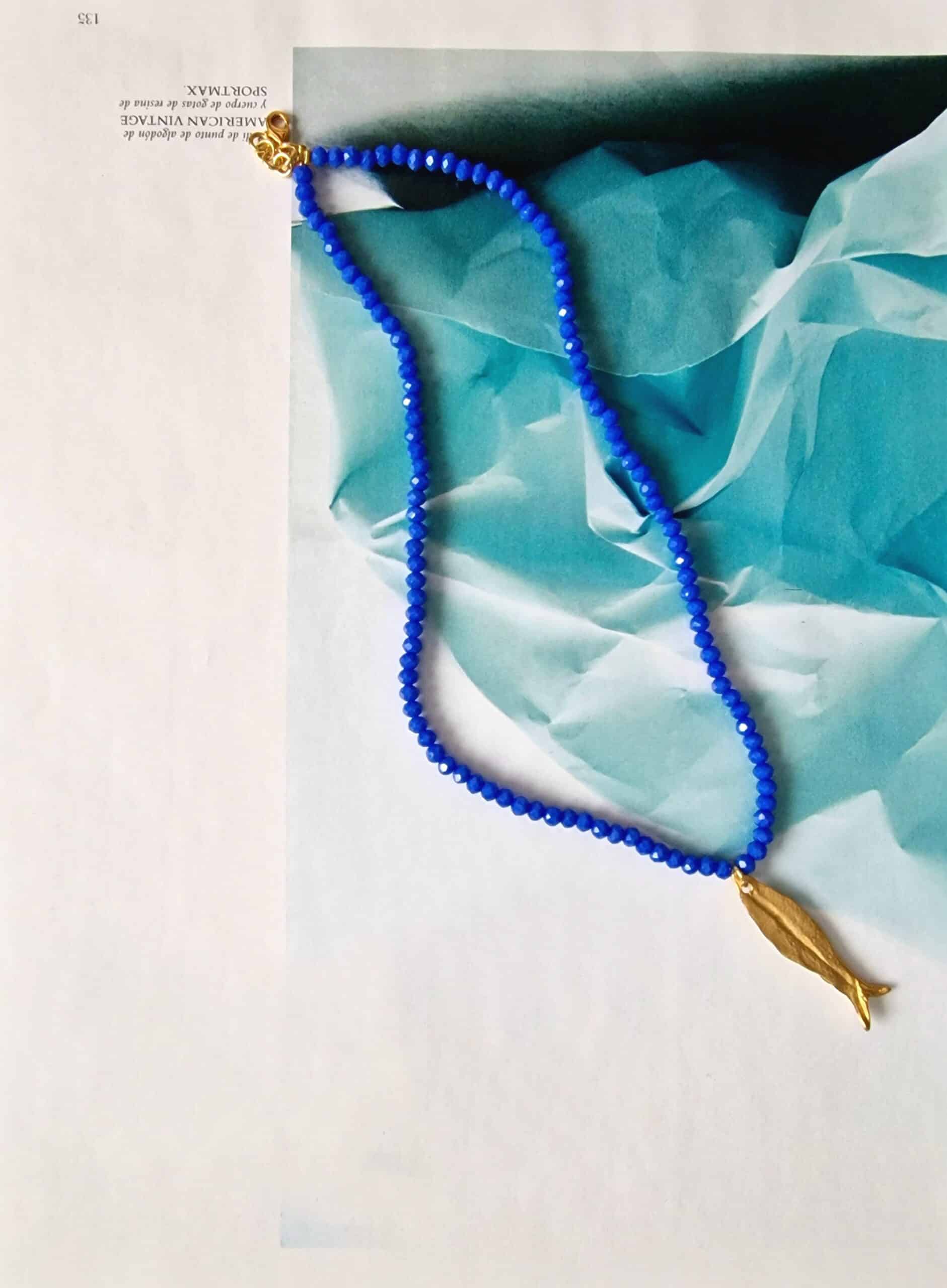 Gargantilla con cristal de rio añil y pez bañado en oro