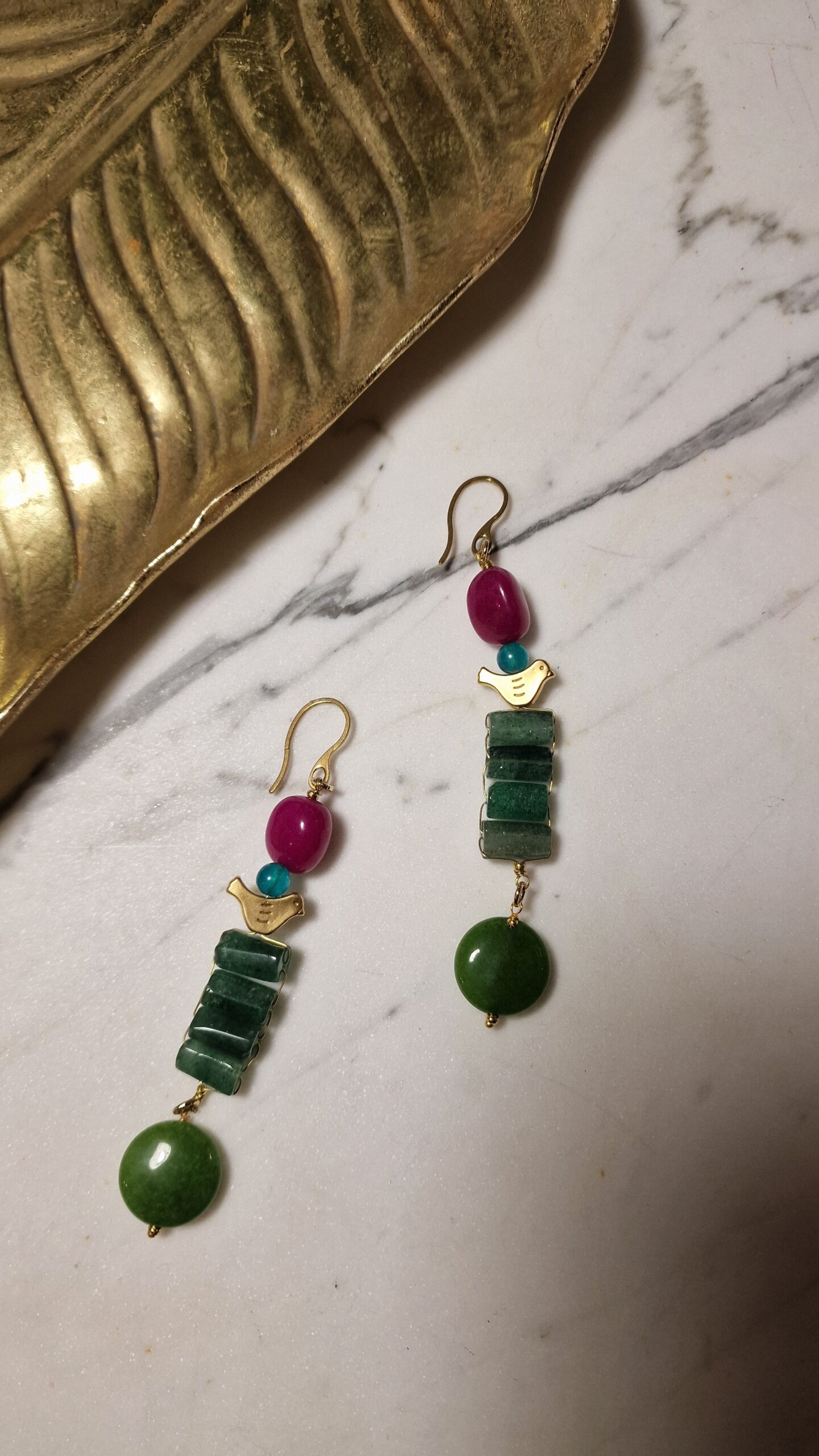 pendiente formado por agatas verdes,turquesa y fresas con pajarito bañado en oro